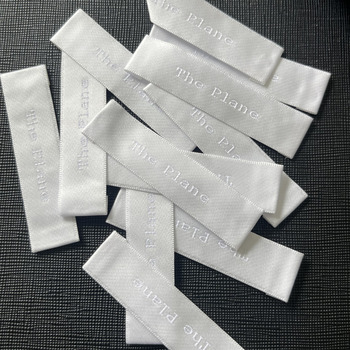 Etiquetas de cuello tejidas autoadhesivas para ropa, patrón rectangular personalizado, serigrafía, corte láser, borde final, pliegue en bolsas